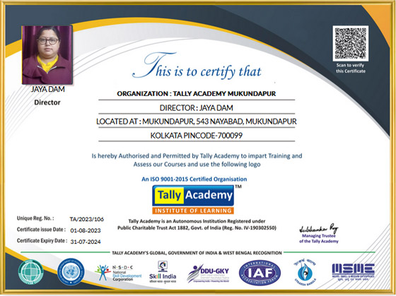 Established in 2005, Tally Academy, India’s one of the most Reputed & Renowned Skill and Talent Development Brand, Tally Academy is an Autonomous Institution Registered Under Public Charitable Trust Act 1882,Govt. of India ( Reg. No. IV-190302550) is also Society Registered (Reg. No. S/2L/47695) W. B. Act XXVI of 1961 .